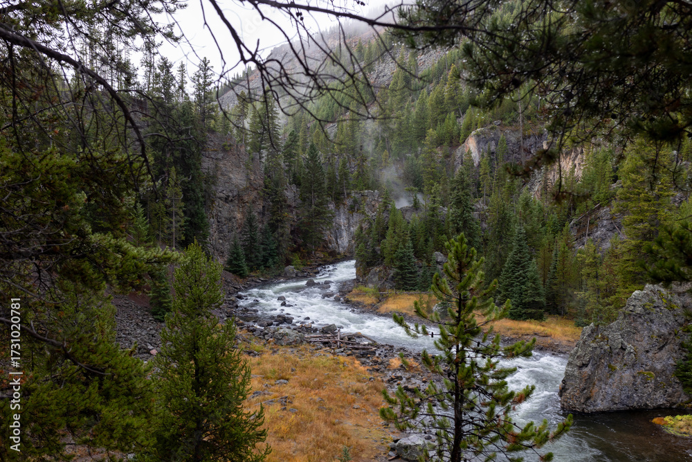 Serene river flowing through a stunning forest canyon, perfect for travel brochures or nature documentaries showcasing the beauty of the wilderness