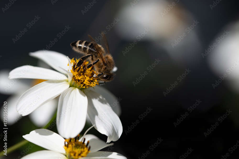 A small honeybee searches for food on a white flower with yellow pollen. In the background, other flowers glow out of the shadows.