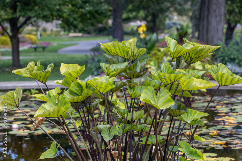 Close up abstract texture background of aquatic colocasia "tea cups" plants (colocasia esculenta) in a water pond in late summer