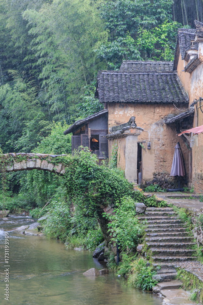Ancient Chinese Village with Stone Bridge, Stream, and Greenery, Lishui, China