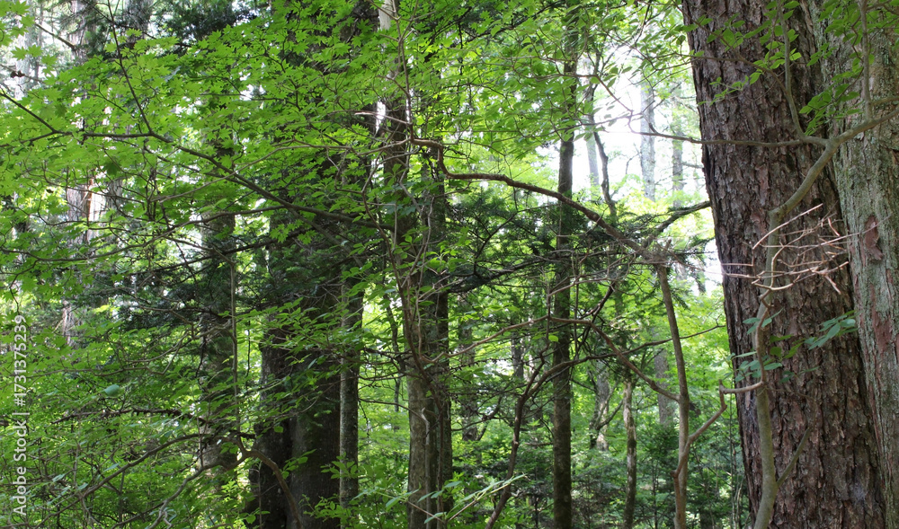 Trees with beautiful bright leaves lit by the sunlight in summer. Trees with lush green leaves in natural forest background.