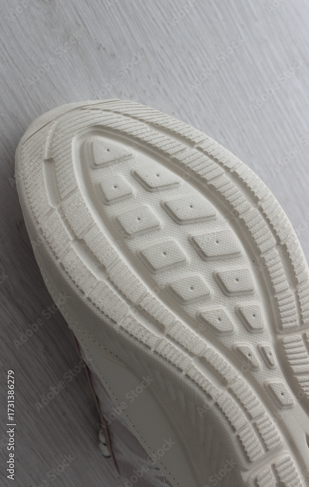 White rubberized sole of woman fitness shoes with a studded surface. Vertical image of active shoes sole bottom
