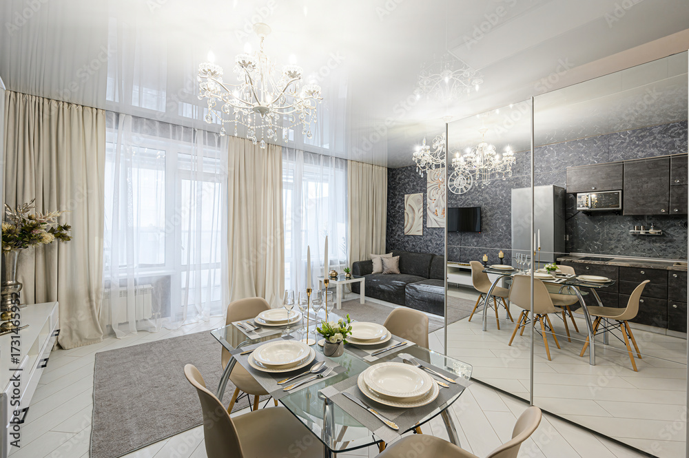 Bright apartment interior featuring a dining area with a glass table, beige chairs, and a chandelier. A mirror wall reflects the kitchen and living room