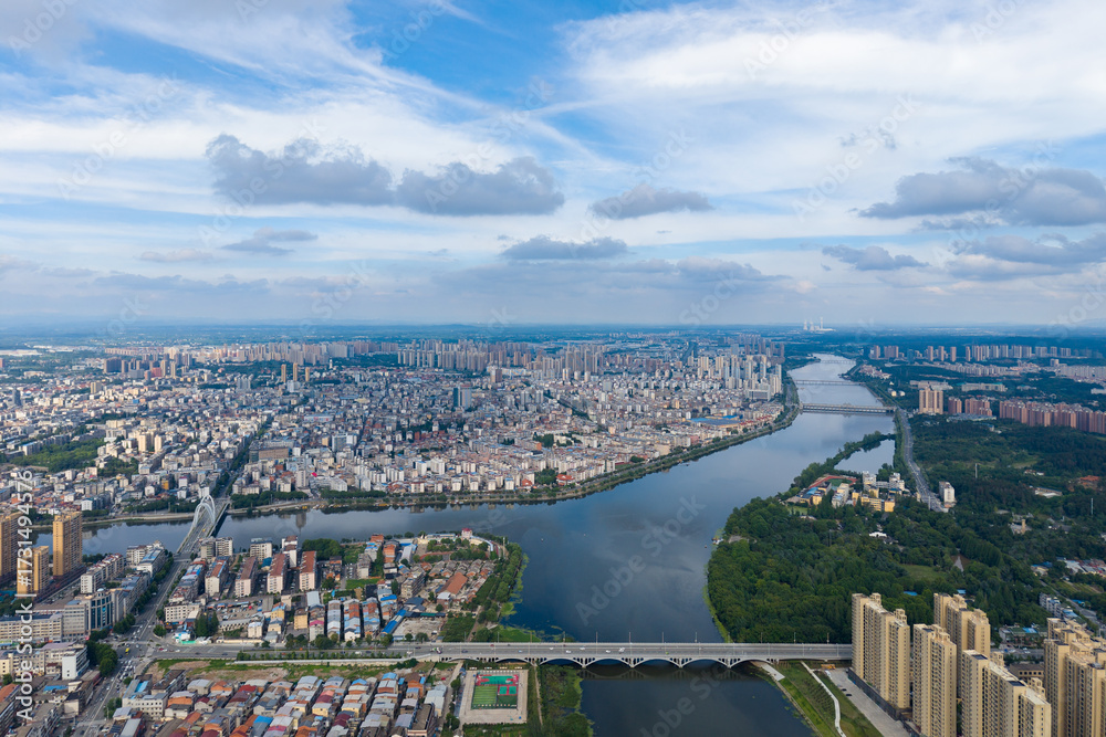Suizhou City Hubei Province China shows a wide river flowing through its urban expanse, with bridges connecting distinct city sections under a cloudy sky.