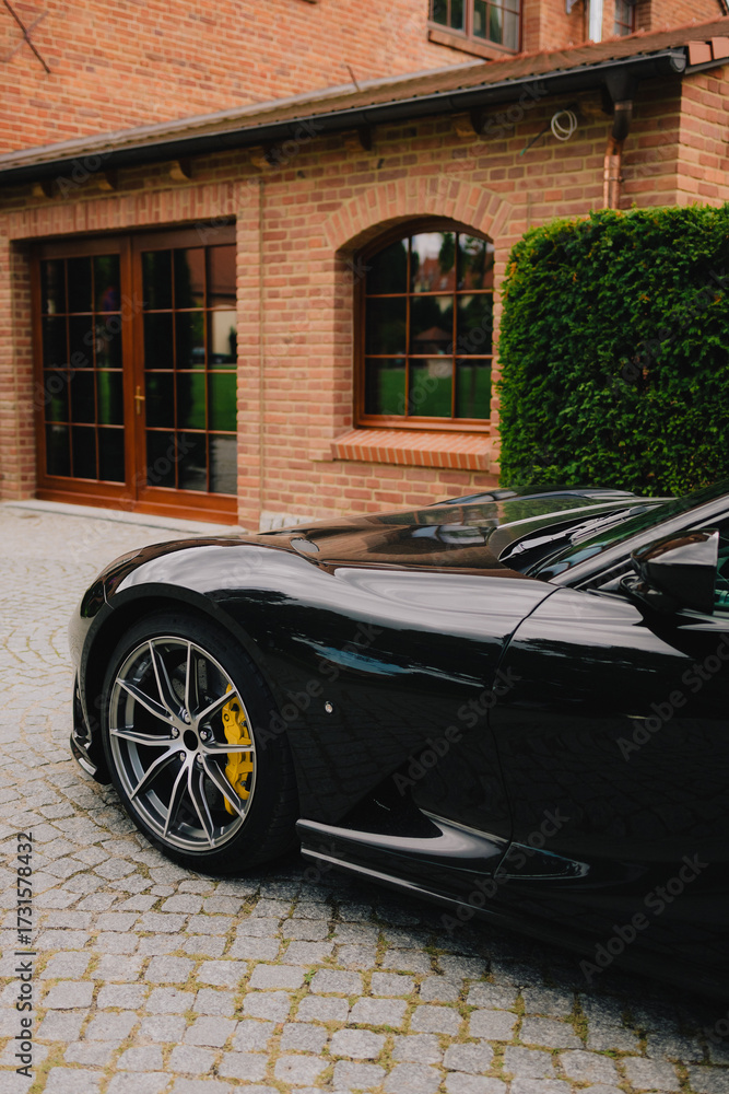 Front side of luxury black sports car with yellow brake calipers, parked on cobblestone driveway in front of brick house with wooden windows and hedge. Sleek black sports car, yellow brake calipers