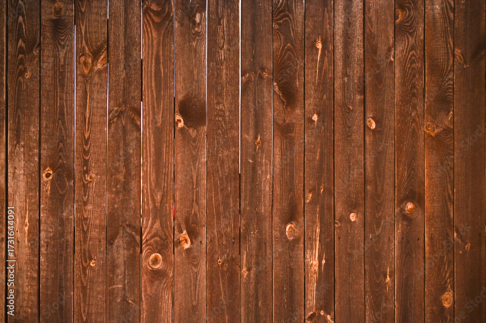 Brown wooden fence with natural grain texture used as background or design element. Wooden planks with knots and lines create rustic pattern for decoration or backdrop