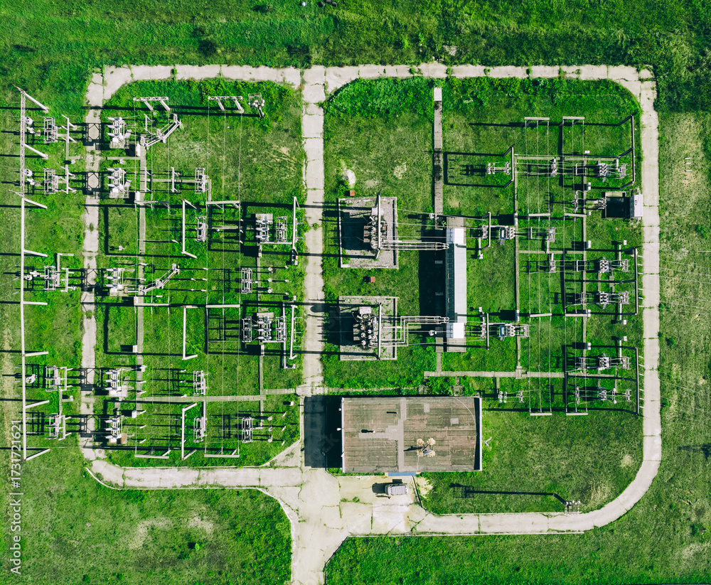 Aerial view of a small electricity substation. Substation with transformers, insulators and switches distributing high voltage