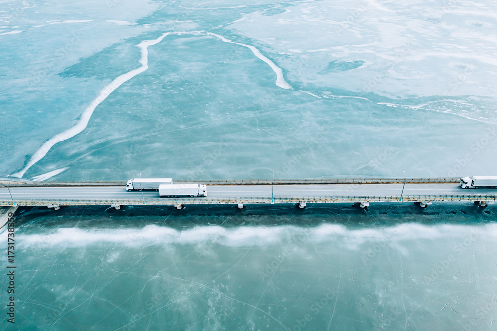 Aerial drone view of white trucks driving on the highway bridge road over iced water lake or river in winter season. Logistic and delivery concept.