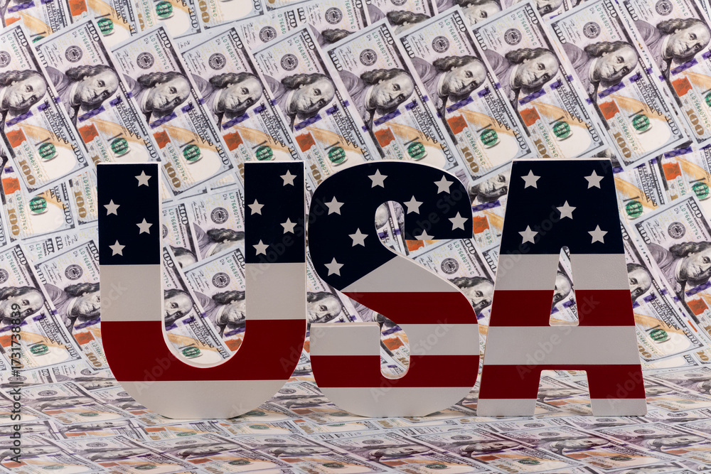 The letters USA with an American flag on them against a background of $100 bills.