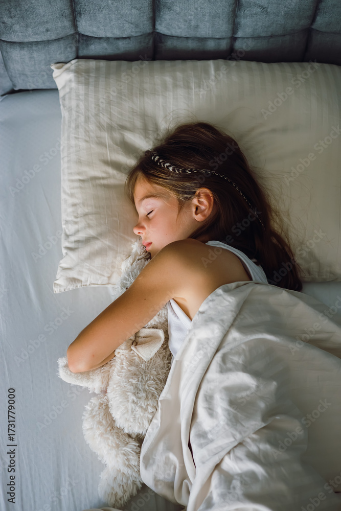 Young girl sleeping soundly in a comfortable bed, embracing a plush bunny toy, high angle view