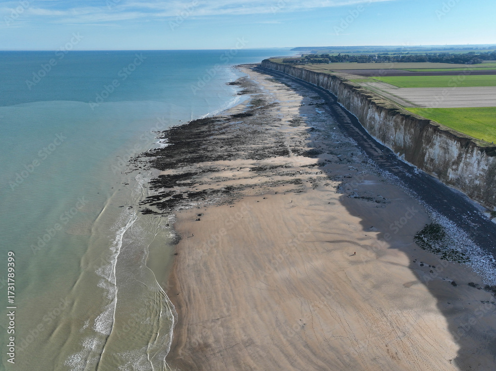 vue aérienne prise avec un drone montrant la ville de Quiberville en Normandie, la plage, les falaises et la mer par beau temps