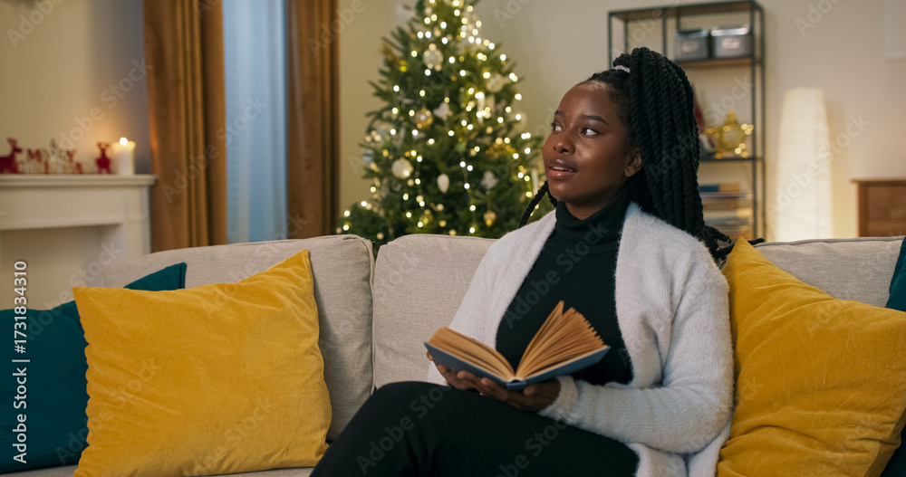 A young woman of multi-ethnic background sits on a sofa, holding a book with a blue cover and reading. After finishing a section, she pauses thoughtfully and looks dreamily out the window.