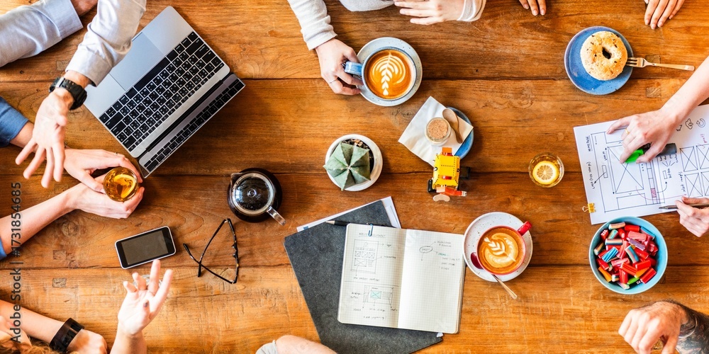 Top view of a wooden table with coffee cups, a laptop, notebooks, and hands of diverse people collaborating. Coffee, collaboration, and creativity. Startup business people in casual meeting at cafe.