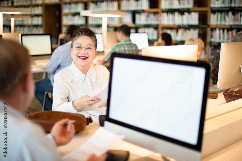 A person in a library, smiling and working on a computer. The library setting is filled with books and computers, creating a focused and studious atmosphere. Senior students in computer class.