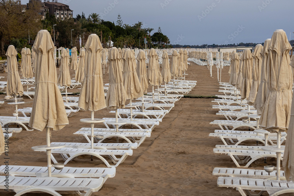 Empty beach with rows of white sunbeds and folded parasols receding into distance under post-sunset light. Palm trees on promenade. Low season tranquility. Kumköy, Antalya, Turkey.