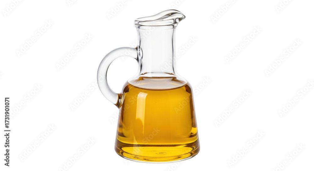 Isolated carafe of golden cooking oil, with handle, kitchenware item on display, no background