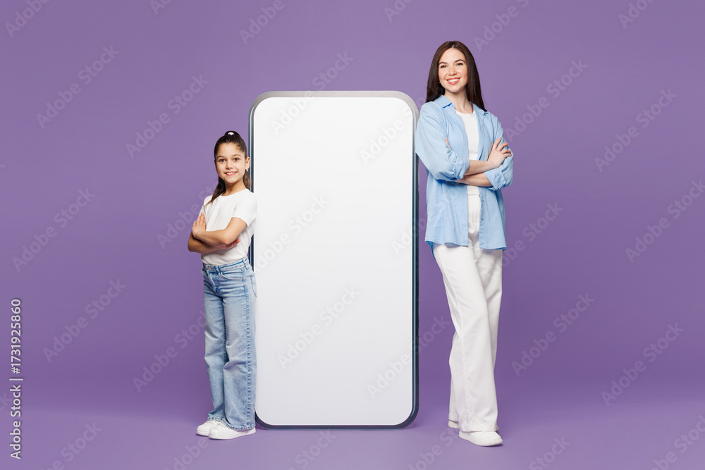 Full body young woman child baby girl 8-9 years old wear blue casual clothes. Mommy little kid stand big huge blank screen mobile cell phone isolated on plain purple background Mother's Day concept.