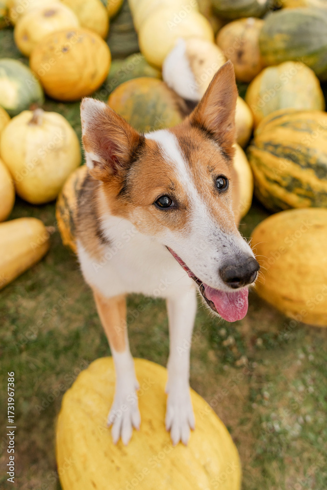 Mixed Breed Dog Standing on Large Yellow Pumpkin
