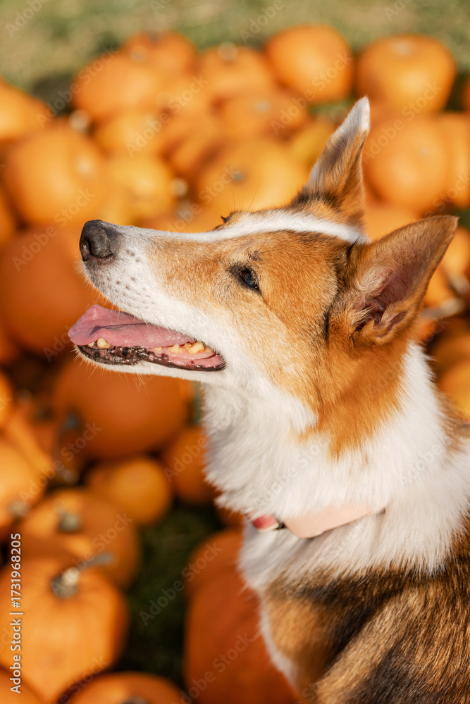 Mixed Breed Dog Close-up Portrait Surrounded by Orange Pumpkins