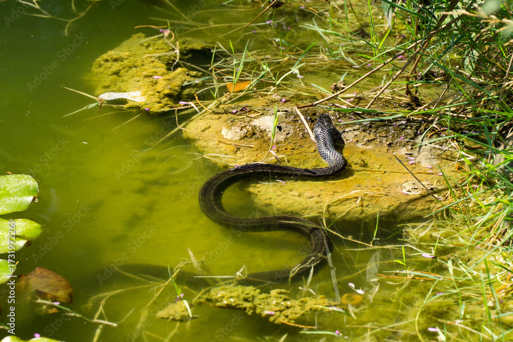 Sleek black Colchis water snake Natrix megalocephala glides along the water’s edge, basking on sunlit rock amidst lush green pond vegetation