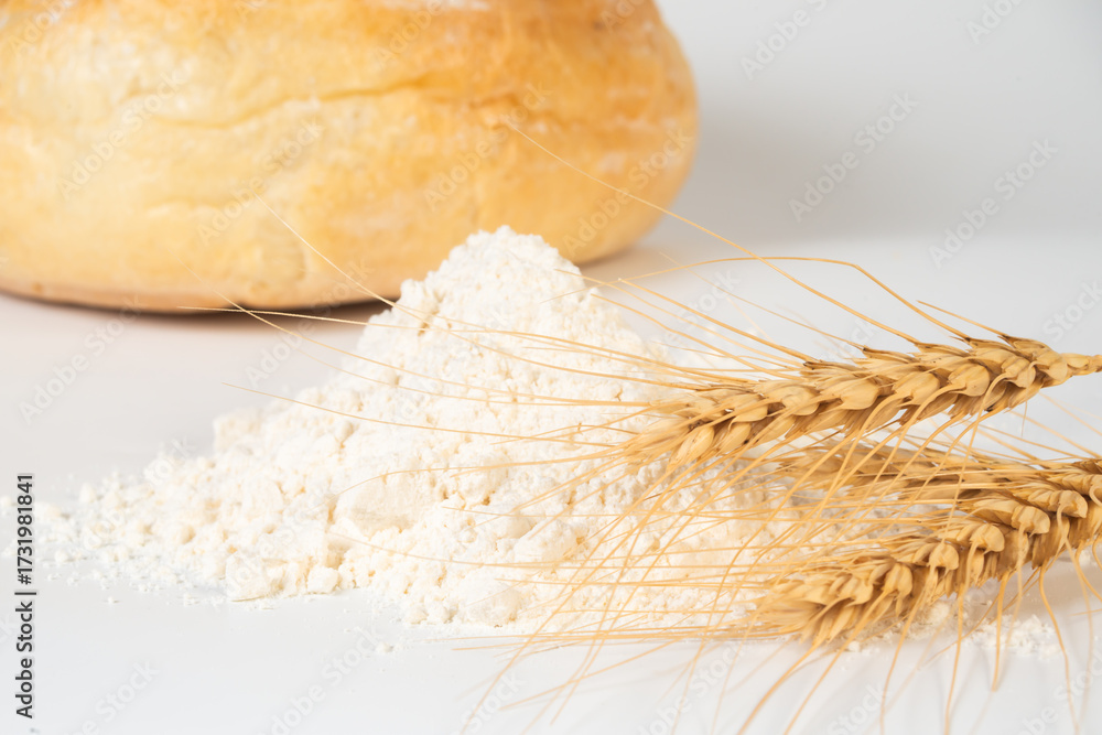 Flour and wheat stalks on a white surface with cheese in the background showcasing traditional food ingredients