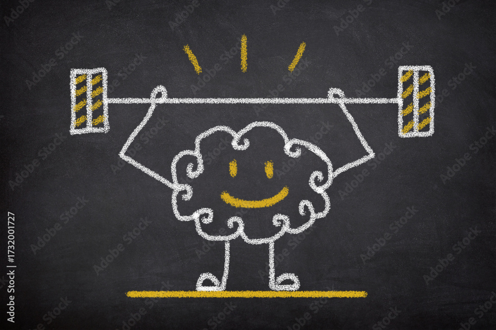 Brain exercise. Human brain lifting weights. Cognitive development concept.