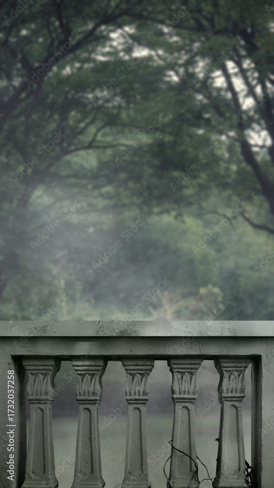 Outdoor view of balustrade railing on the balcony overlooking a blurred forest. The scene is scary and mysterious. Dramatic smoke or fog effect. Mockup. Copy Space. Wallpaper or Halloween background