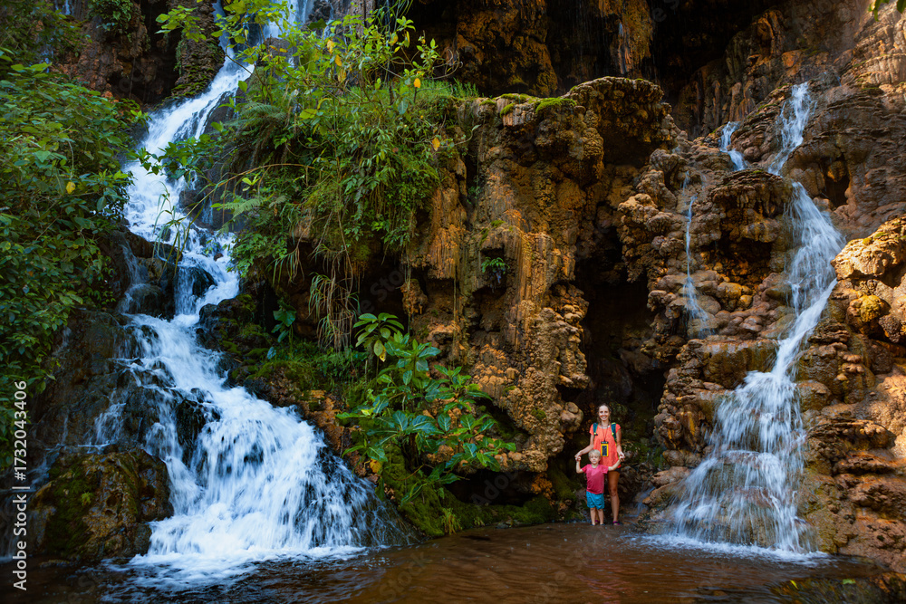 Mother with child standing under scenic Goa Tetes waterfall in East Java, Indonesia. Lush jungle surroundings, dramatic cliffs, and cascading streams create perfect backdrop for adventurous family tra