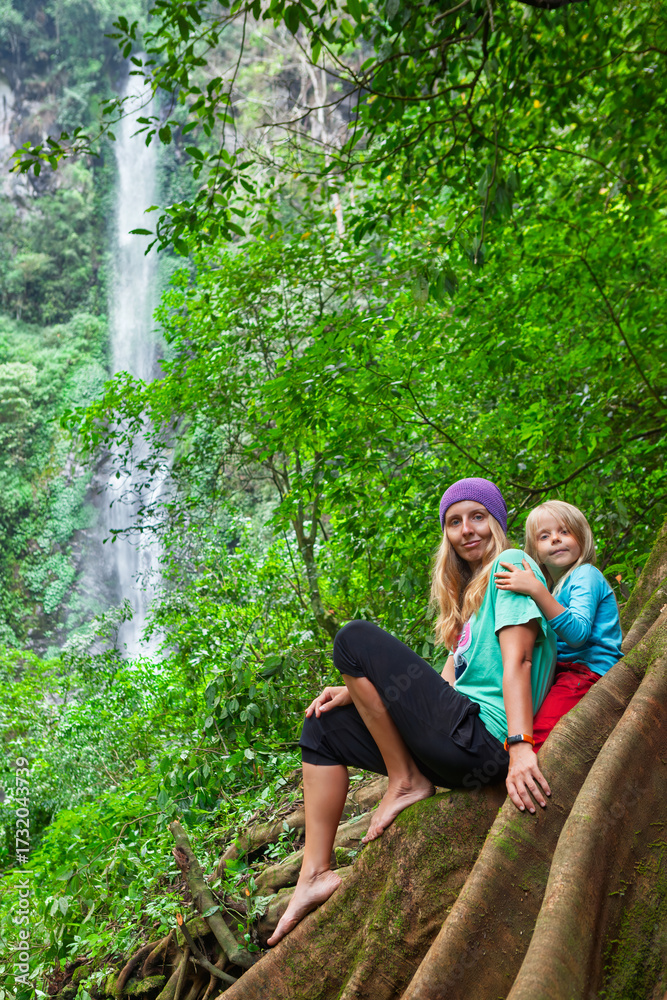 Mother and child rest on giant tree roots in lush tropical jungle near high waterfall. Perfect for eco-tourism, nature escapes, family friendly hikes with breathtaking views and peaceful surroundings.