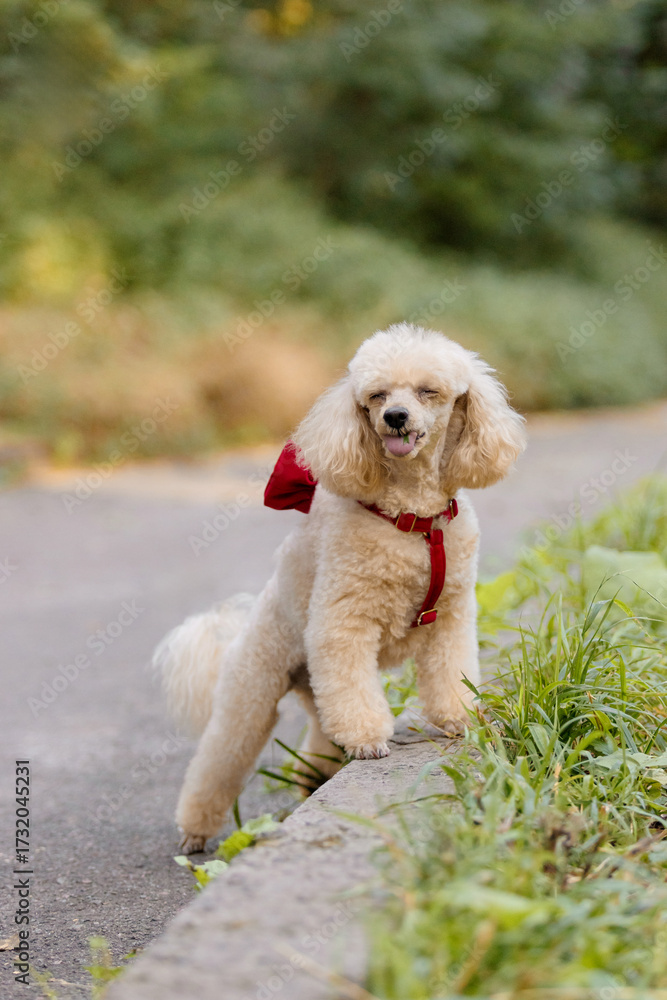 Elegant White Poodle with Red Bow in Natural Park Setting