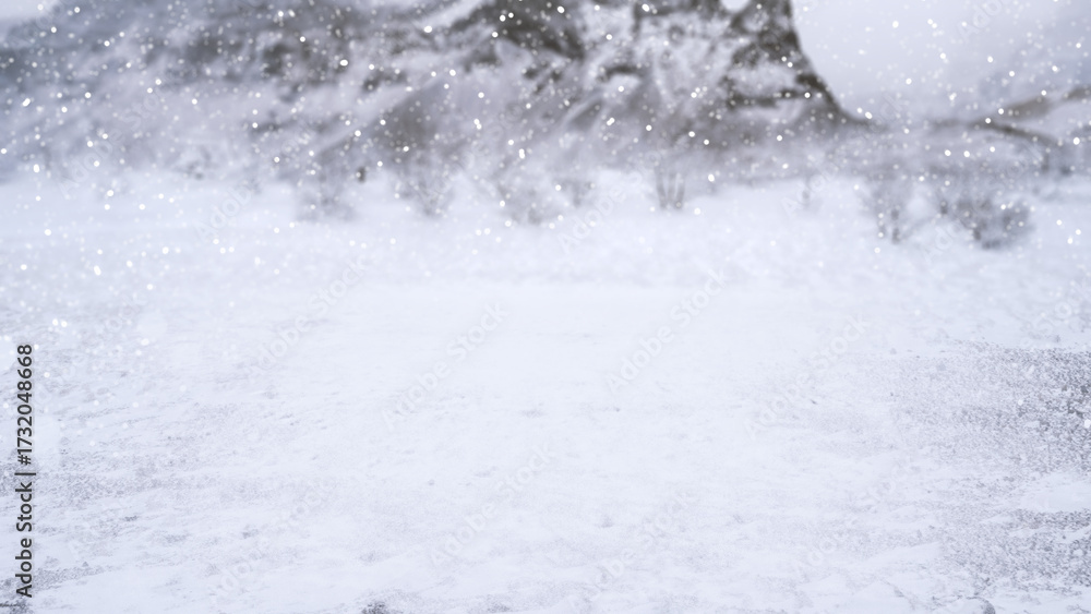 Winter scene with snowfall descending upon a snowy field and covering the ground and trees. Seasonal design or holiday themes for winter