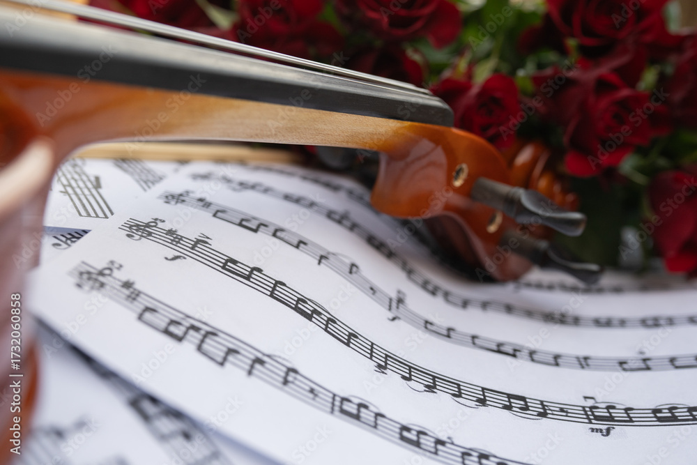 Close-up of a wooden violin resting on sheet music surrounded by vibrant red roses, creating a romantic atmosphere that beautifully blends music and nature in a harmonious composition