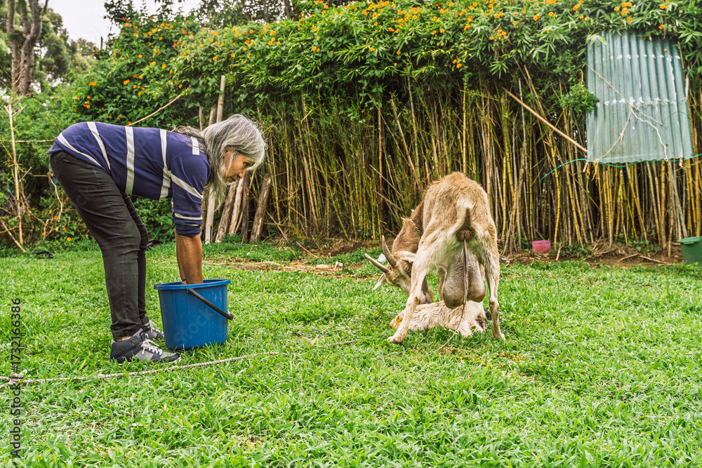 Colombian woman milking goat by hand beside blue bucket in grassy rural area with bamboo and flowering plants.