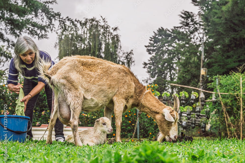 Colombian woman crouching beside goat and newborn kid on grass in rural area with flowering plants and tall trees.