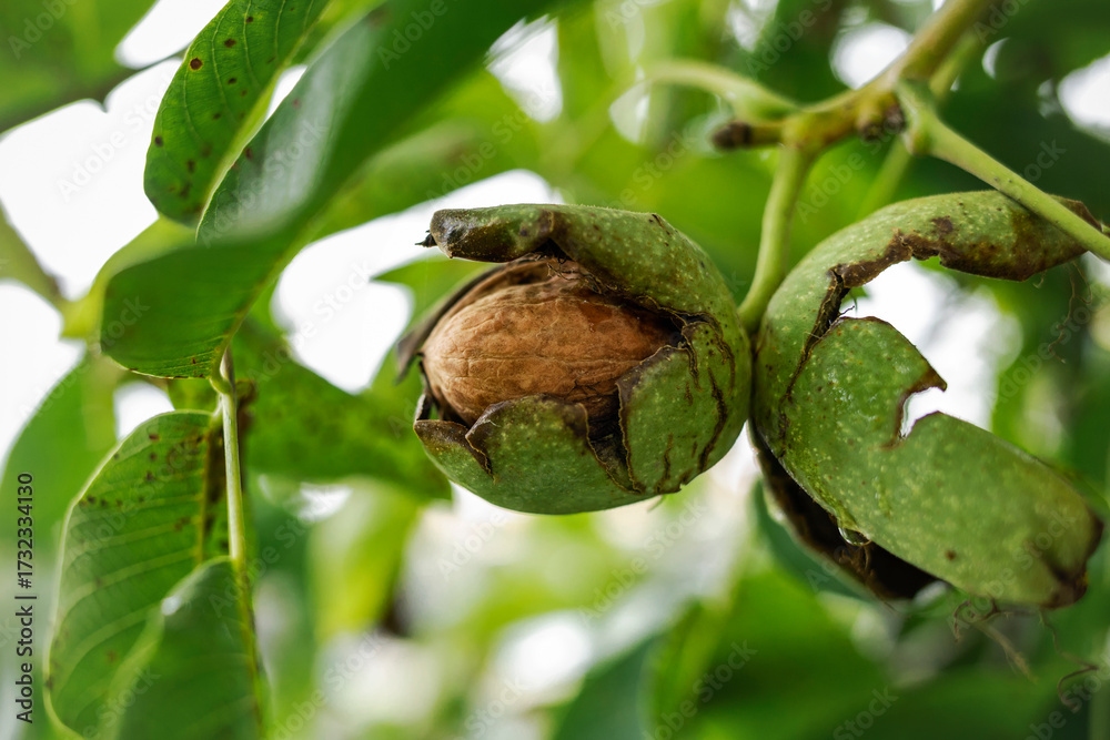 Walnut Tree Harvesting. Walnuts in Green Shell on Tree. Walnuts Ready To Pick.