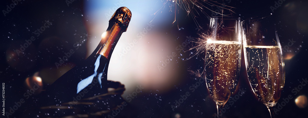 Festive lights and champagne in glasses for toasting. Night sky with glowing sparklers and golden bokeh. Horizontal background for celebrations and new year's eve with space for text.