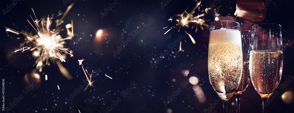 Festive lights and champagne in glasses for toasting. Night sky with glowing sparklers and golden bokeh. Horizontal background for celebrations and new year's eve with space for text.