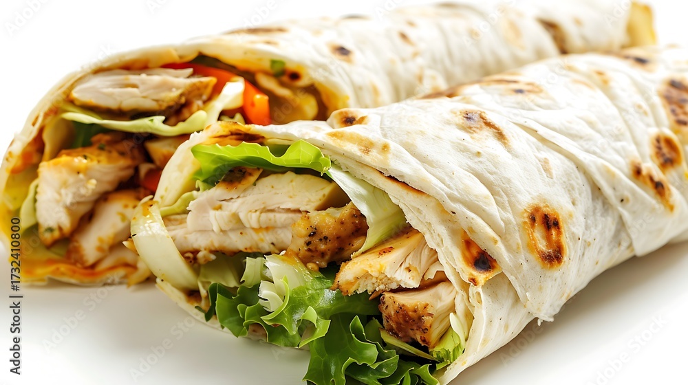 Two chicken wraps with lettuce and vegetables on a white background close up food photography style shot