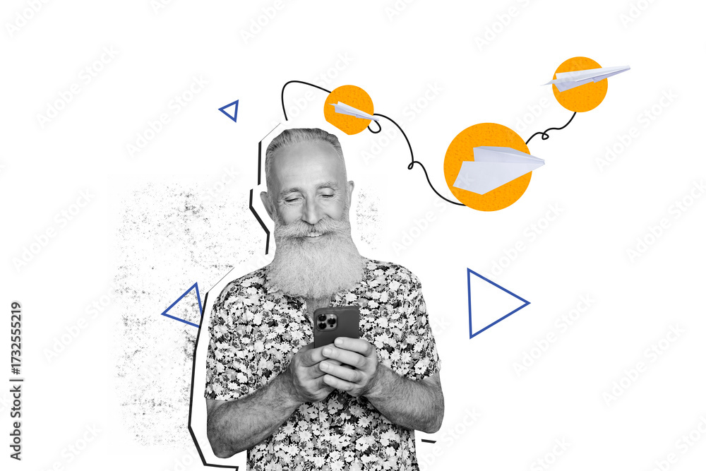 Trend artwork sketch composite 3d photo collage of silhouette paper plane message fly origami aged man hold smartphone type chatting blog