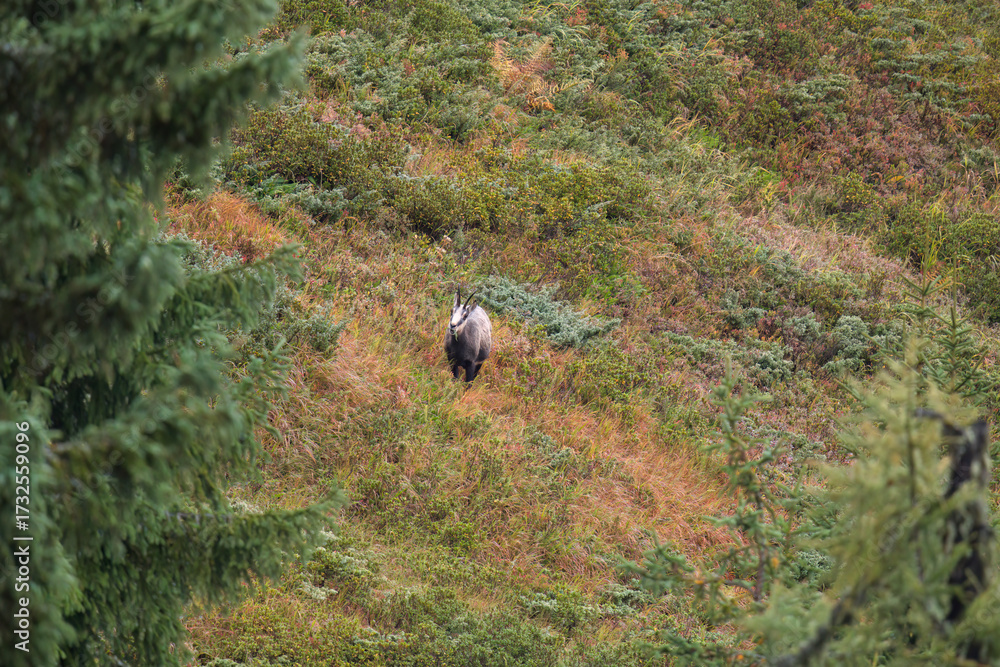 a old chamois female, rupicapra rupicapra, on a mountain meadow at a autumn day