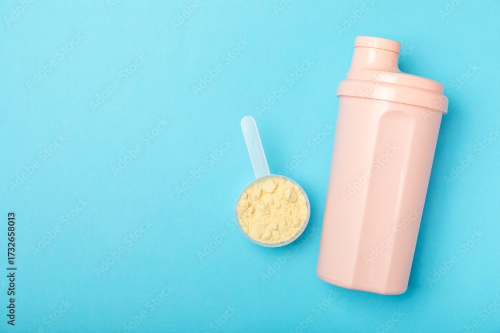 Protein shake with protein powder on a colored background. The powder is mixed with water or milk. A dietary supplement for a balanced diet. Whey protein. Fitness and gym diet nutrition.