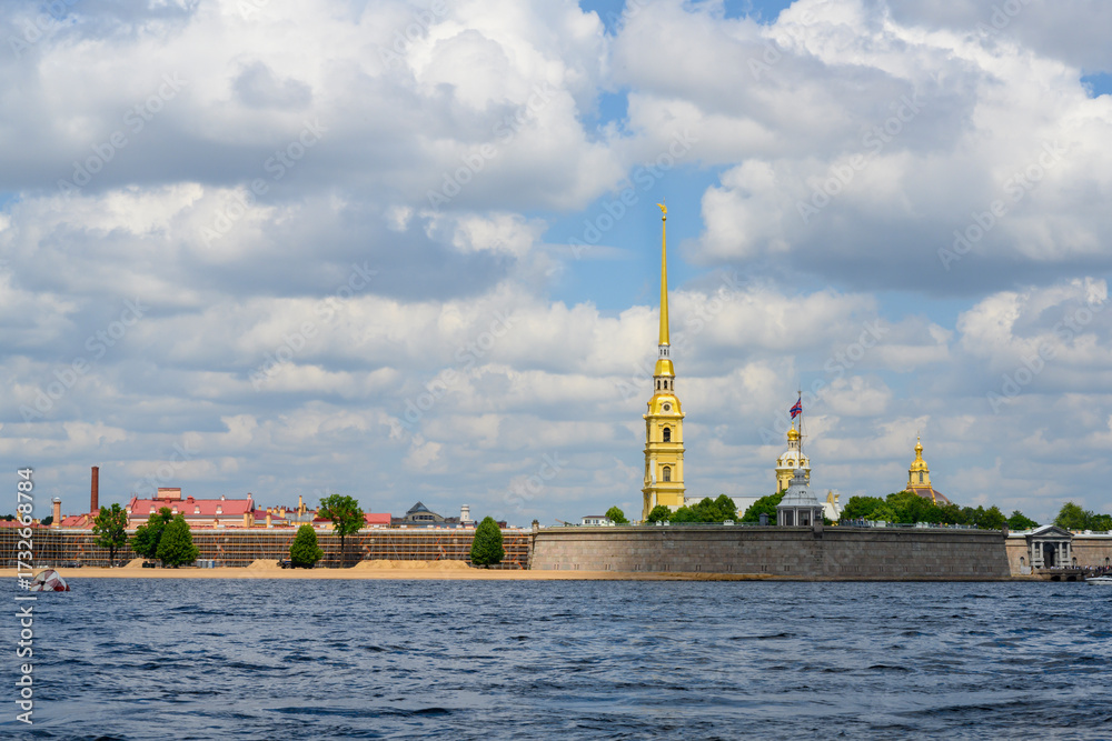 View of the tower and spire of the Peter and Paul Fortress in St. Petersburg from the Neva River