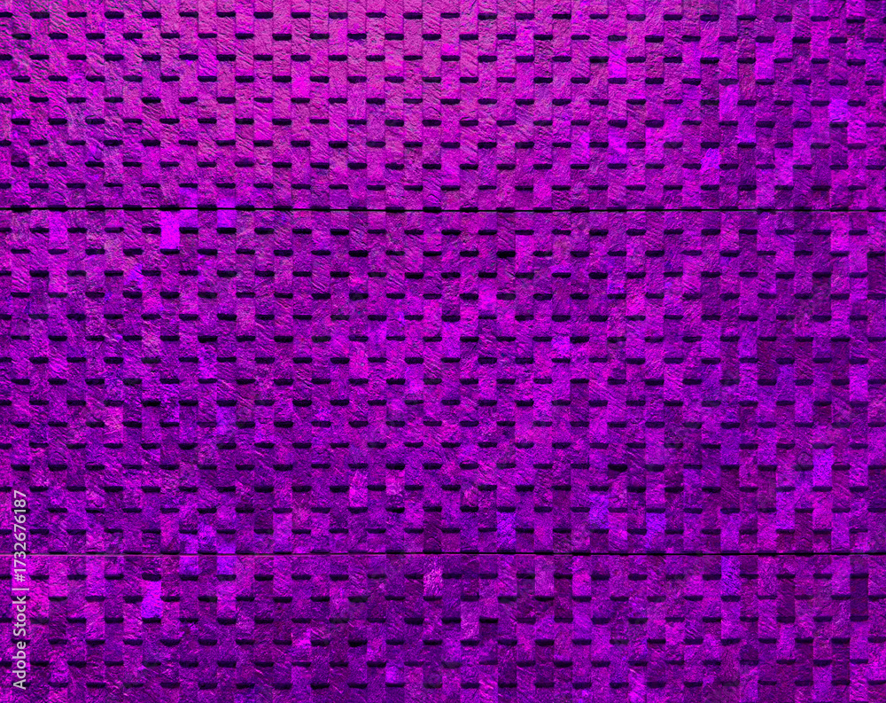 Industrial neon purple or violet concrete wall texture with a gridded pattern of raised rectangles and vertical seams. A weathered, abstract backdrop with traces of rust and grime.