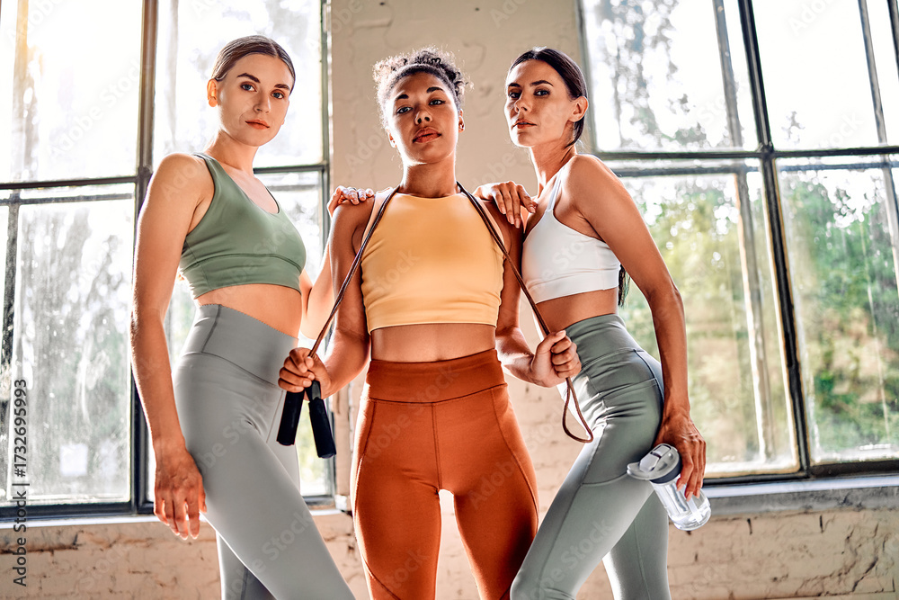 Three diverse, attractive fit women posing in sportswear at a fitness gym. Motivation, fitness, strong and healthy bodies.