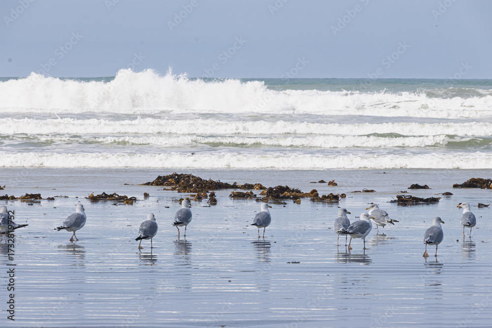 Silbermöwen (Larus argentatus) am Strand mit Bramdung im Hintergrund