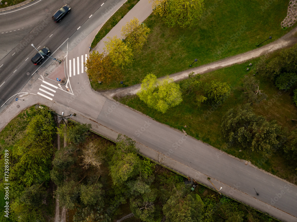 Aerial top-down view of Männiku, Tallinn, Estonia, capturing a spring day with lush green trees, clean asphalt roads, pedestrian crossings, and cars in motion under soft evening light
