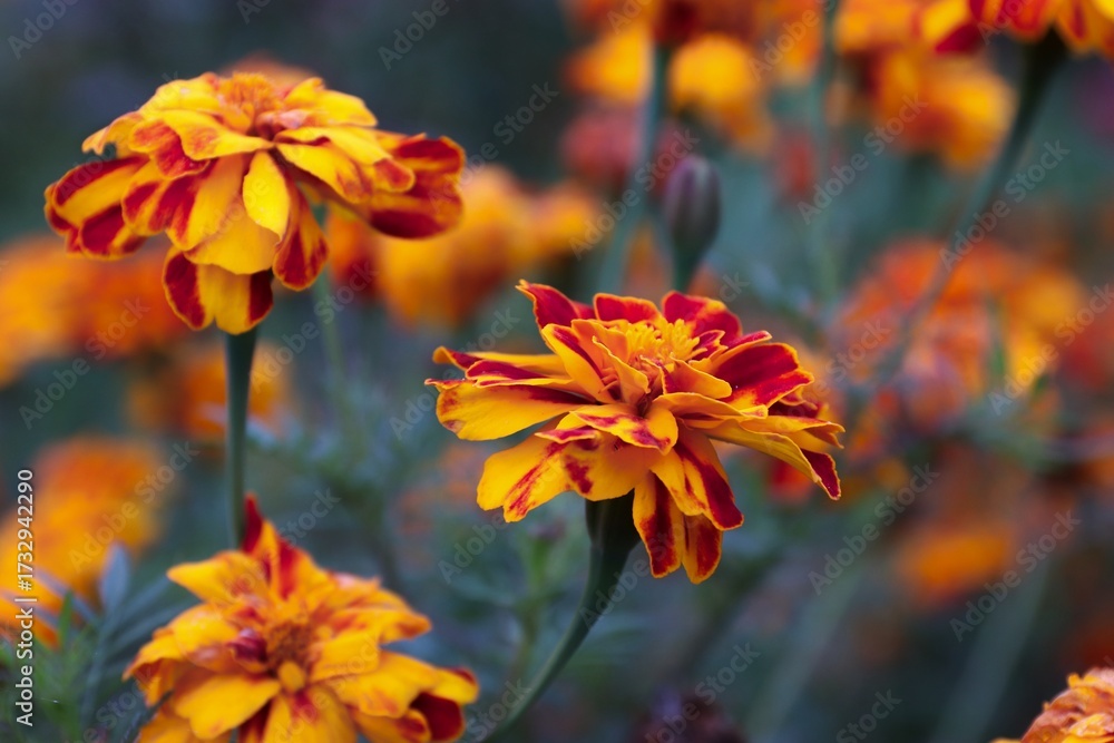 Bright marigolds with yellow-orange petals and red accents — a concept of autumn blooms, decorative flora, garden design, and natural beauty for packaging, blogs, floristry, or educational content