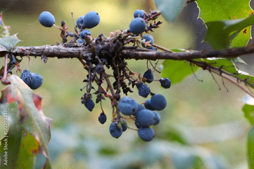 Dark blue mahonia berries on a branch with glossy leaves — a concept of autumn harvest, botanical texture, natural beauty, and seasonal change for packaging, eco-design, educational