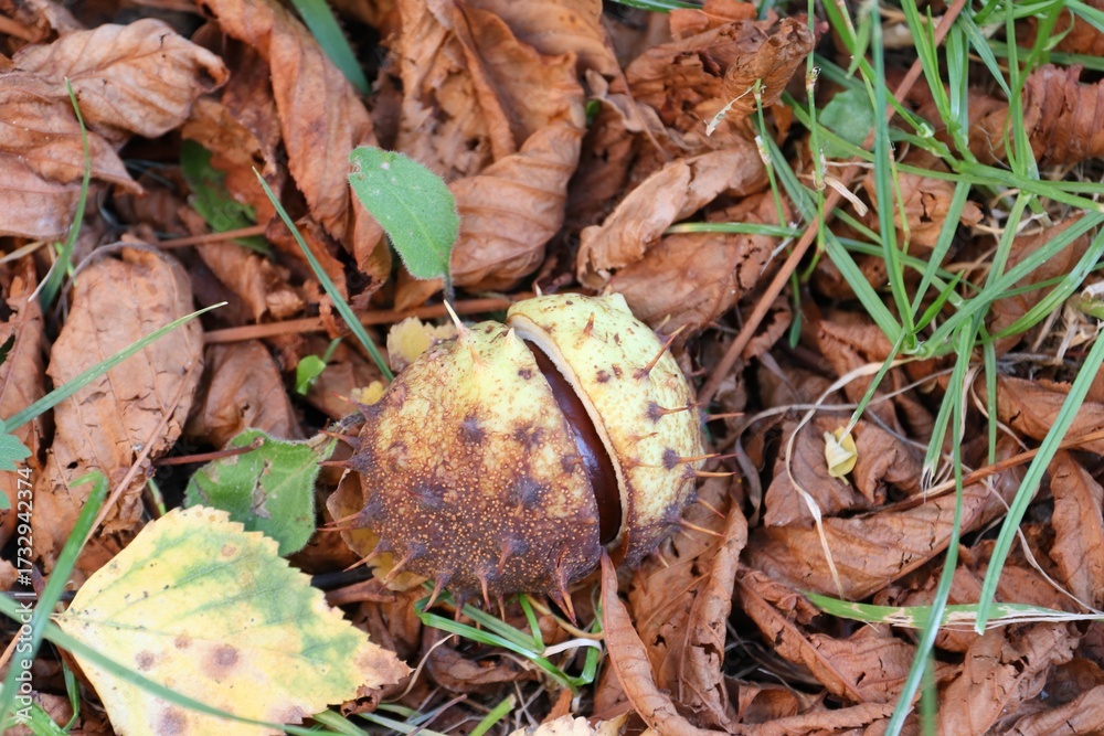 An open horse chestnut in a prickly shell among autumn leaves — a concept of the natural cycle, autumn harvest, earth texture, and botanical aesthetics for packaging, eco-design, educational or editor