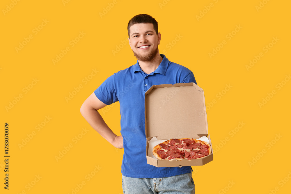 Happy young man holding cardboard box with tasty pepperoni pizza on yellow background